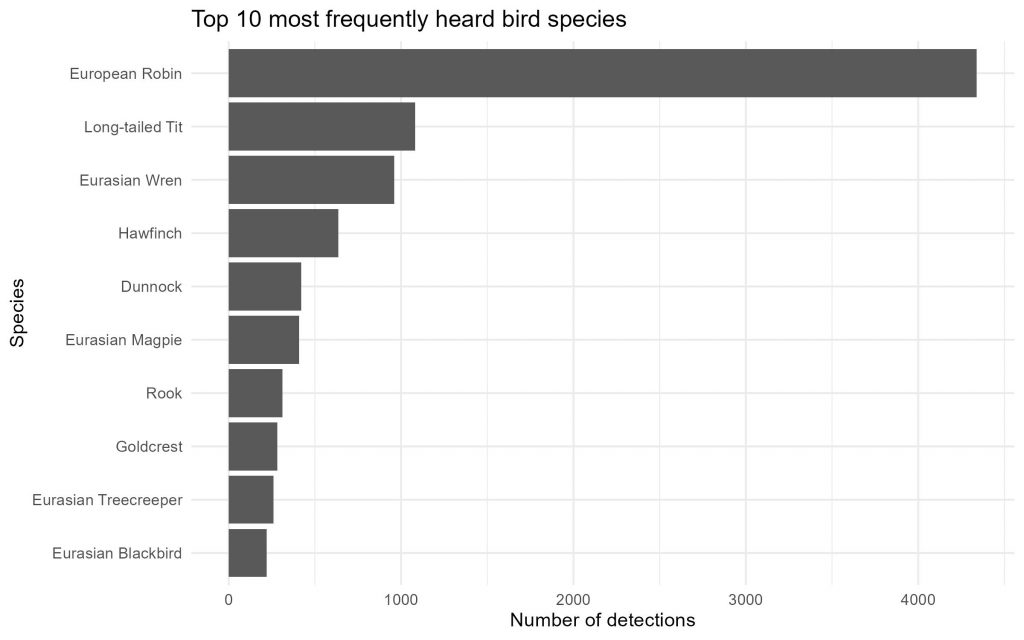 Below you can see the top 10 birds most frequently heard on the Audiomoth sensors. European Robins were the most detected, but this could be the same, or a few individual Robins with loud and consistent songs.