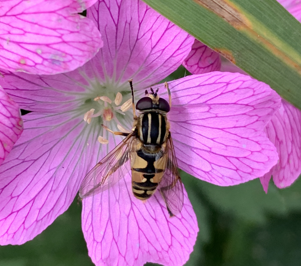 This hoverfly (Helophilus sp.) looks a lot like a wasp, which is on purpose. This is what is known as Batesian mimicry, where harmless organisms evolve colour, patterns or the body shape of a more fierce, toxic or venomous species. This species clearly has two wings, and a fast and easy way to differentiate them from a wasp or bee is their characteristic large eyes (Image: Willow Neal).