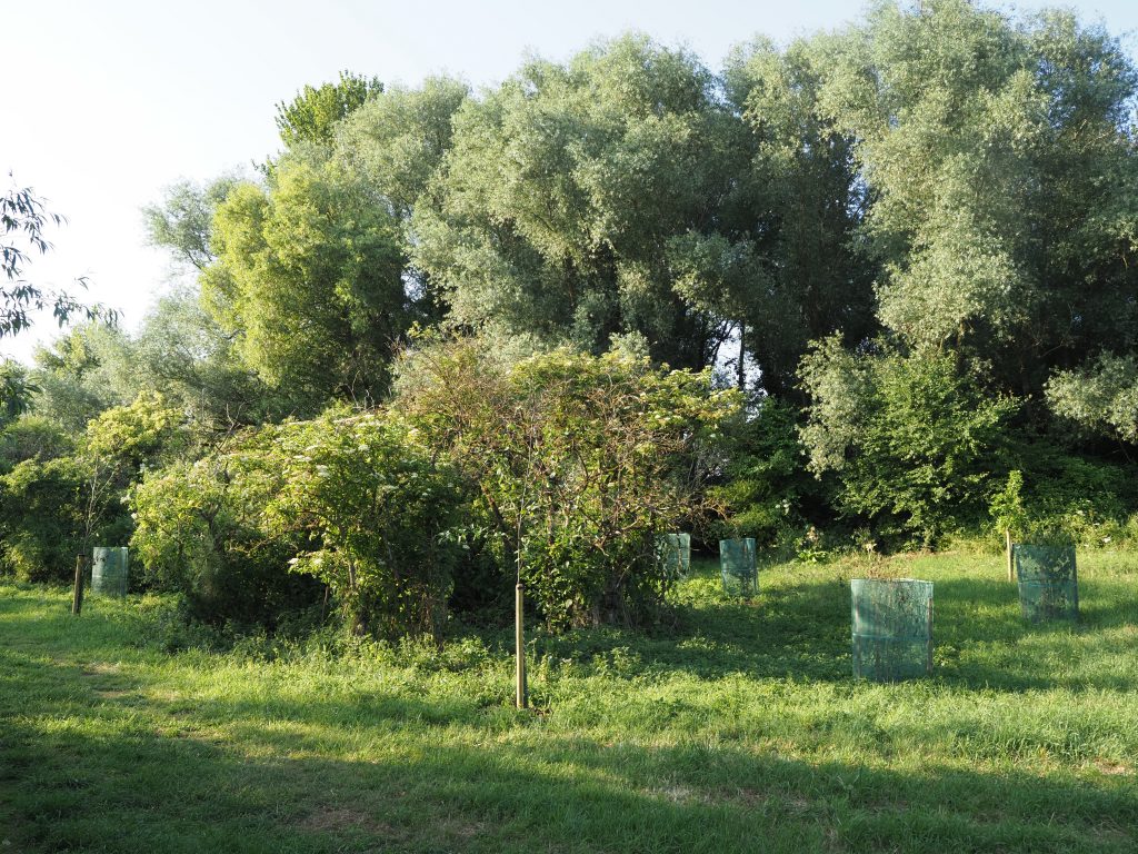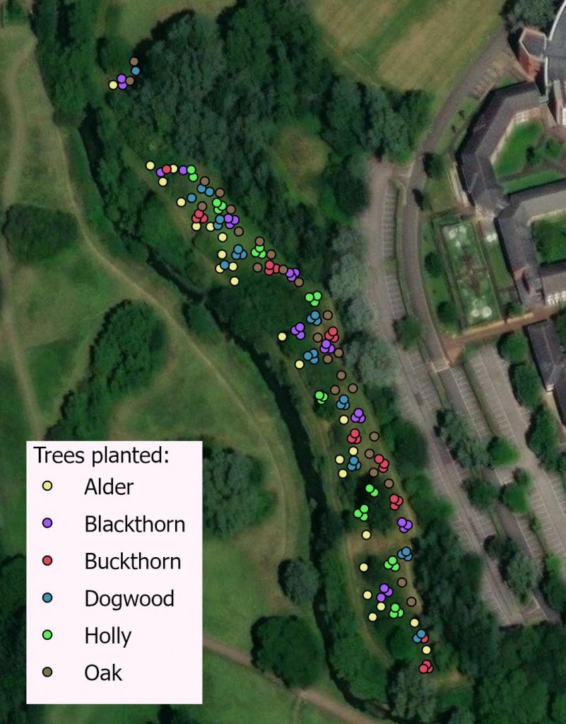 We have planted 150 native trees like Common Alder (Alnus glutinosa), Dogwood (Cornus sanguinea), Blackthorn (Prunus spinosa), English Oak (Quercus robur), Buckthorn (Rhamnus cathartica) and Holly (Ilex aquifolia) on the slope that leads down to the riverbank) and have been recording their height to monitor how they are growing. Subsequent planting over the next few years will allow a diverse age of trees to grow, along with natural regeneration, creating complex habitat for wildlife and other woodland plants.