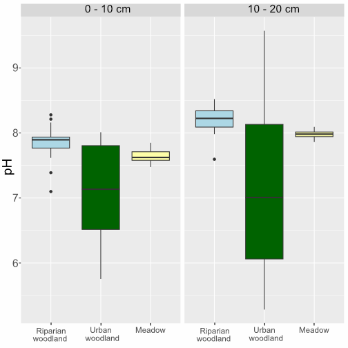 Soils tested in the OpenLiving Lab ranged from pH 5.28 to pH 9.57, with most being neutral-alkaline (around pH 7.5-8). The deeper soils from 10-20cm depth were more alkaline (around pH 8), but the surface topsoils in the floodplain meadow and riparian woodland were more neutral, with a mean pH of 7.4 .